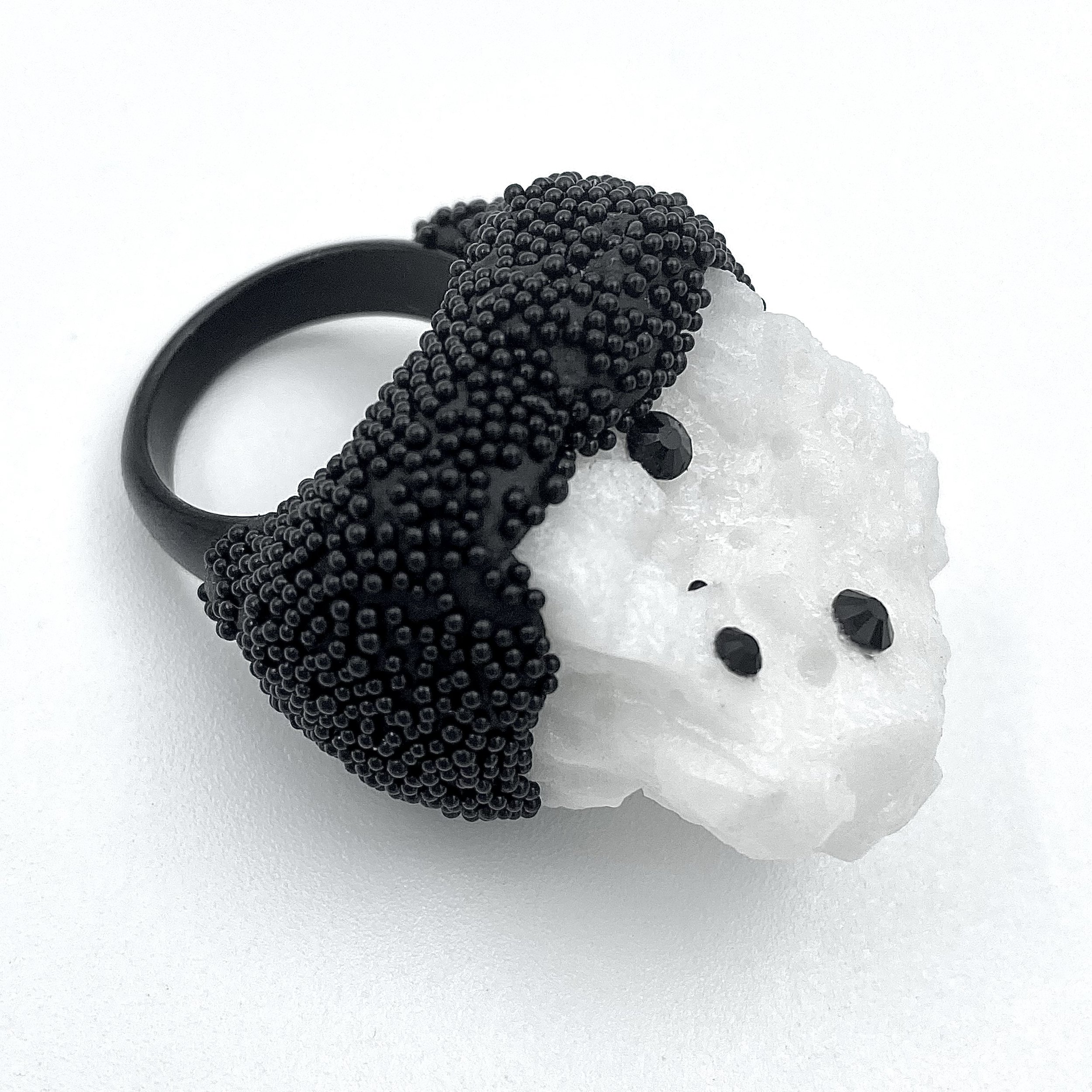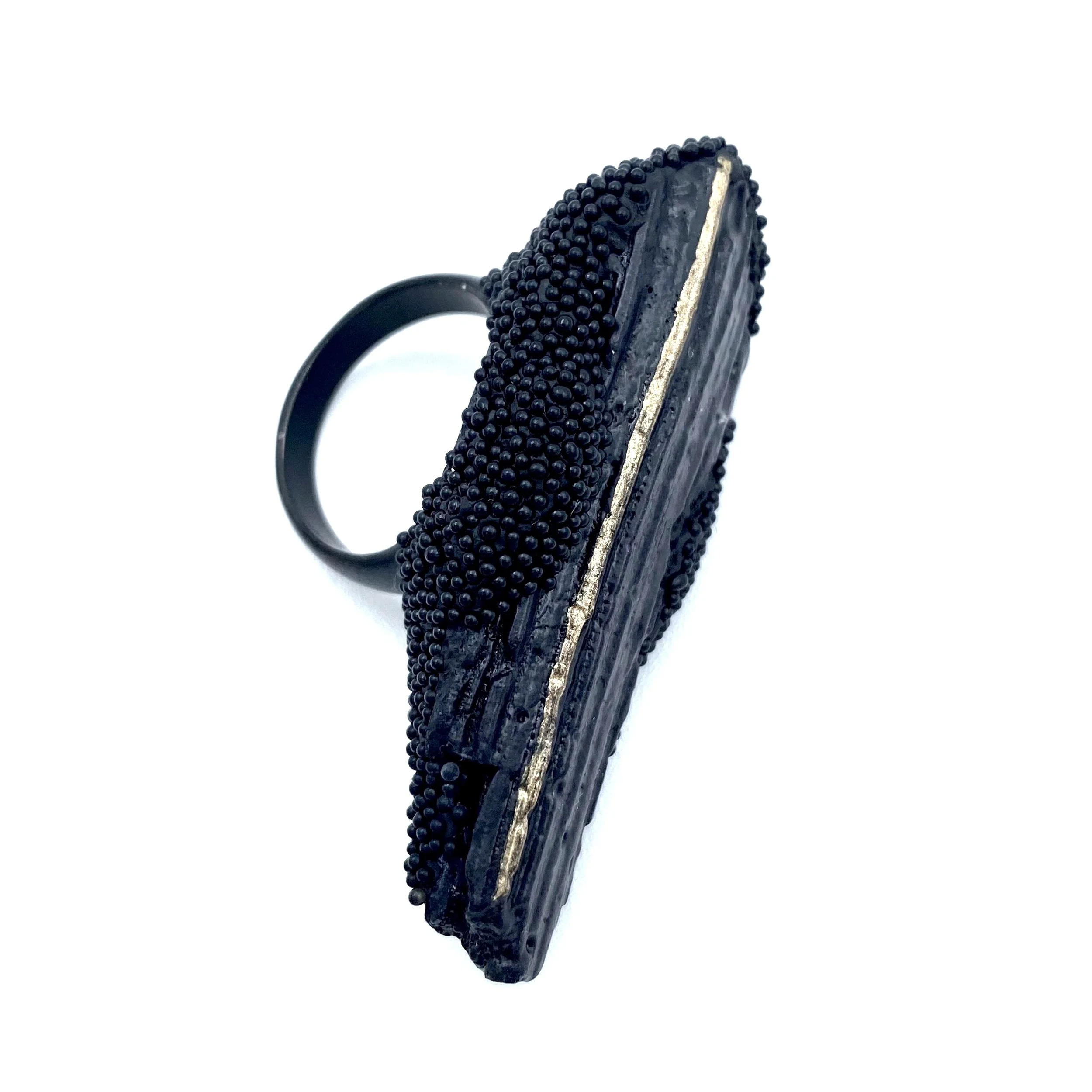This series is made from kilncast glass, gold leaf enamel, and opaque black glass bead, Each work is unique and considered a miniature sculpture designed to have an intimate connection with the wearer. The glass is cast from rocks and crystals and They serve as statement pieces for special occasions, openings, or parties.